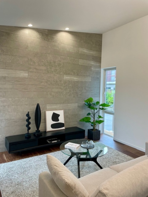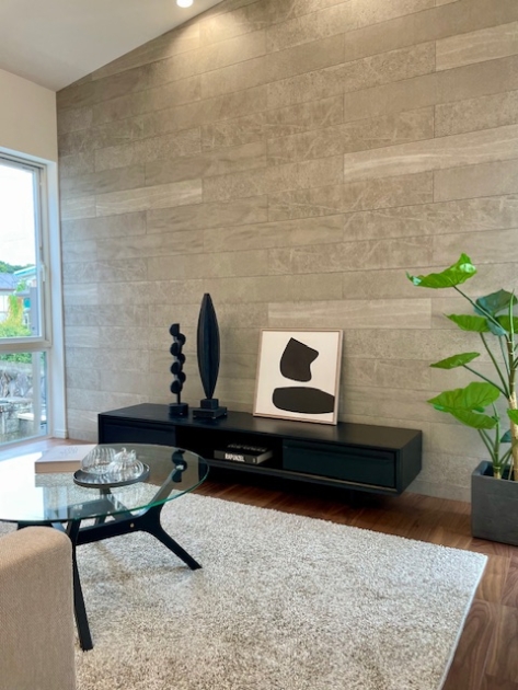 今回コーディネートしたモデルハウスは壁面タイルがあるシャープなリビング