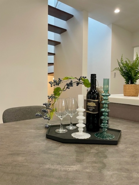 ダイニングテーブルもシャープなセラミックグレーの天板に。